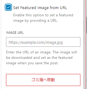 「Smart Auto Upload Images」を有効化すると各投稿の編集画面に「Set Featured Image from URL」という項目が追加されるようになります。チェックを入れるとURLの入力枠が表示されるので、ここにShopifyからエクスポートしてきたExcelの当該記事の「Image Src」欄の内容をコピペして保存すると、ここに入力したURLの画像をアップロードした上でアイキャッチに設定して保存してくれます。