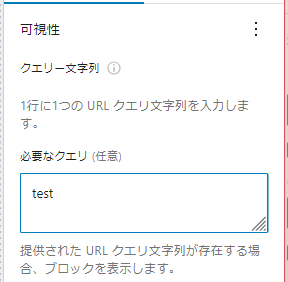 「可視性」の横のマークから「クエリー文字列」を選び、「必要なクエリ(任意)」の欄に確認用URLとして設定したい文字列を入力します。この時、(任意)以外の入力箇所に入力すると、意図した動作にならないのでご注意ください。